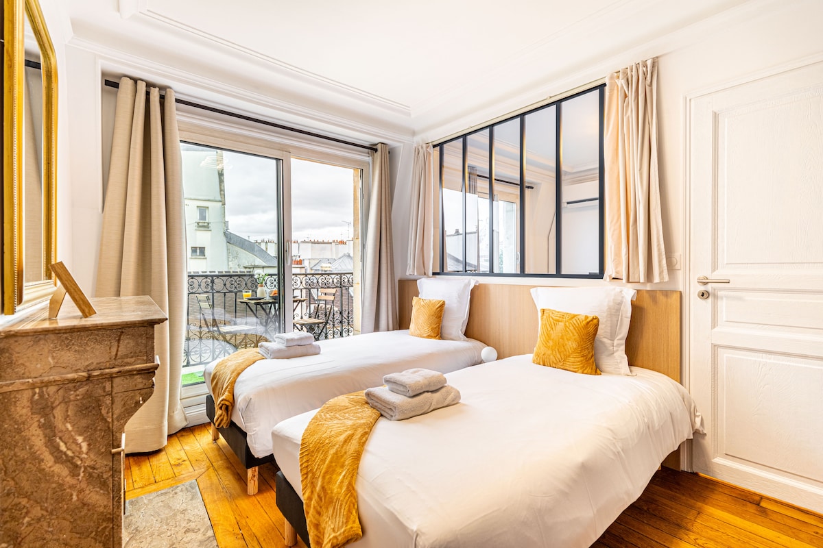 Balcón verde con vistas a la iglesia del Sagrado Corazón, con una decoración increíble. Gran barrio en SOPI = sur de Pigale y la famosa «rue des martyrs» (ver libro «la única calle de París»), Montmartre, ópera, Louvre. 3 habitaciones (250 pies cuadrados/70 m2) para parejas (no fiestas con amigos ni bebés). Cocina de lujo (famosa marca francesa «la cornue»), escalera mecánica, aire acondicionado + ventiladores, buena cama y sofá... Foto, diseño y decoración de mercadillo.