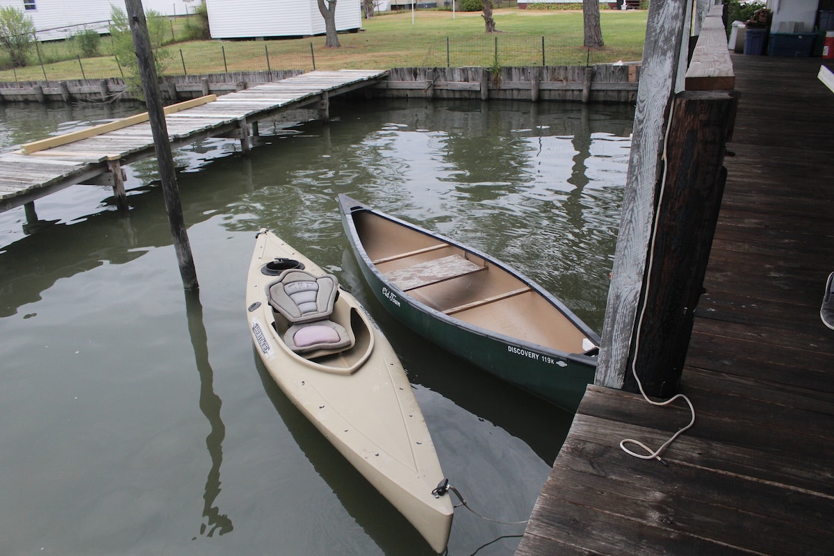 Violinista en el arroyo: kayaks, canoa y muelle compartido