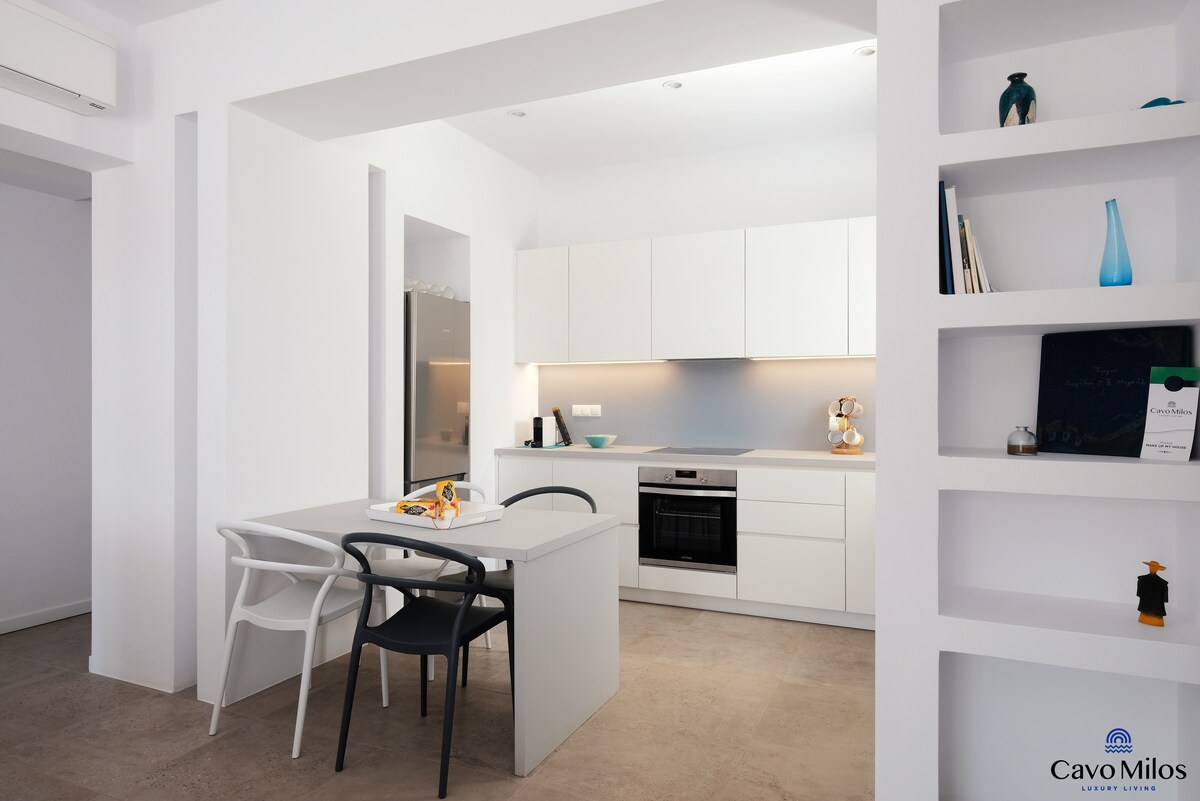 Lujoso apartamento ático con impresionantes vistas al mar. Este apartamento en el último piso, bellamente diseñado y completamente renovado, te rodea de lujo moderno. Situado en un barrio tranquilo a solo 70 metros del mar y a poca distancia a pie del puerto de Adamas, es el refugio perfecto para una familia o hasta 3 parejas. Nuestros huéspedes cuentan con servicio de conserjería personal. El apartamento puede ser atendido bajo petición.