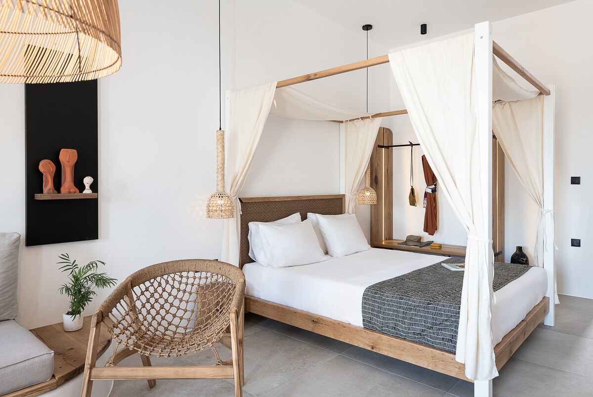 Relájate en la suite Echoes Exclusive en Echoes Milos, perfecta para 2 huéspedes que buscan comodidad y tranquilidad. Acurrúcate en la cama tamaño king, disfruta de un café de tu máquina Nespresso y contempla las impresionantes vistas al mar. La suite cuenta con un minibar, una cocina americana al aire libre totalmente equipada y duchas interiores y exteriores, lo que garantiza una estancia acogedora y privada con todas las comodidades modernas.