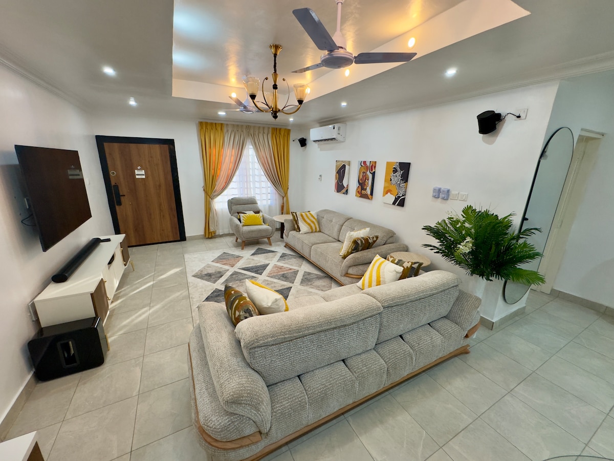 Stay in style at The Buk3, a luxurious two-bedroom apartment in the affluent Roman Ridge area—just 10 minutes from the airport and 12 minutes from Accra Mall. Enjoy a spacious living room, equipped kitchen, 2.5 bathrooms, and balcony. The apartment includes 24/7 security, high-speed internet, and backup power for total comfort. Conveniently located near a main road and opposite a supermarket, with cafés, restaurants, and ATMs nearby. Perfect for business or leisure stays in central Accra.