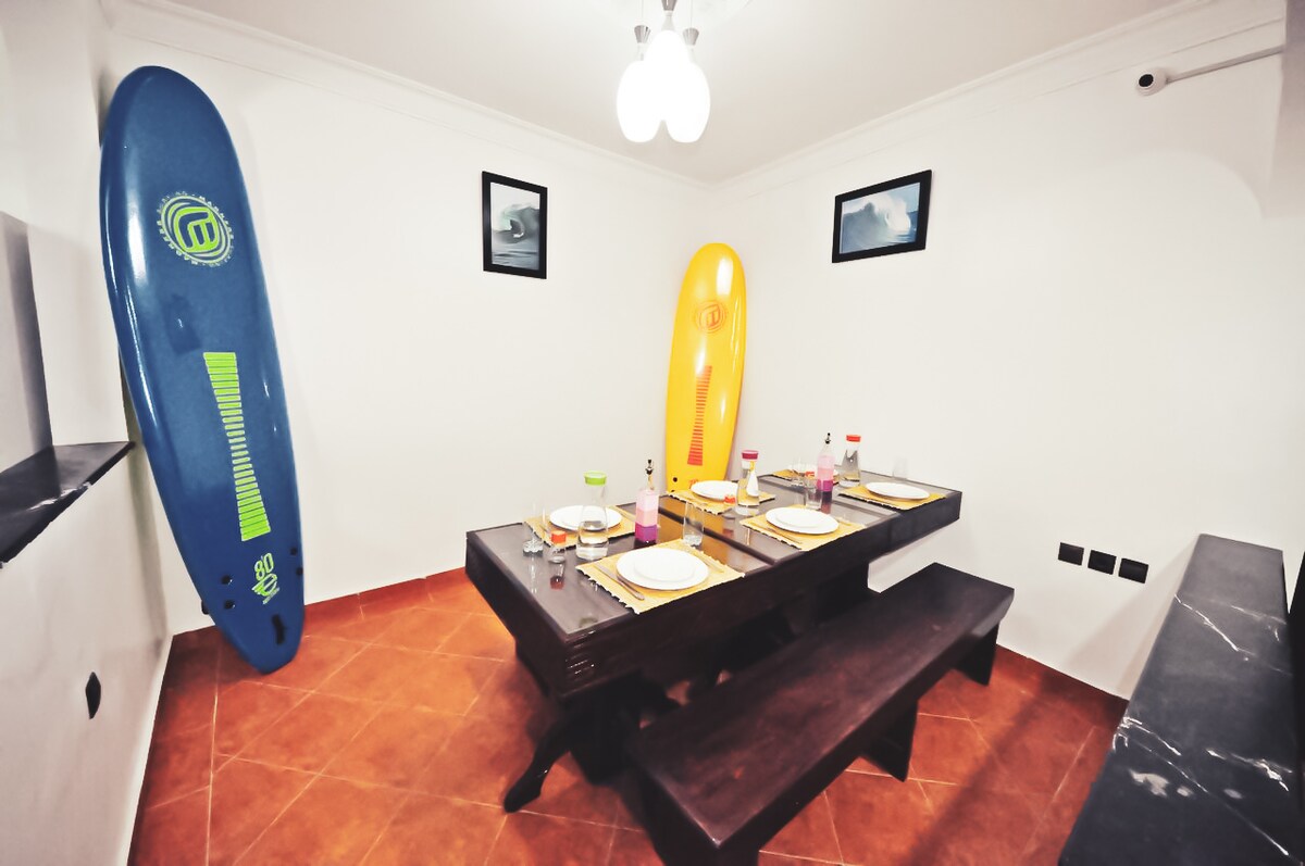 La casa de SURF HOLA se encuentra en el tranquilo pueblo de Tamraght a solo 5 minutos a pie de la playa. Tenemos 6 amplios apartamentos disponibles y cada habitación está equipada con instalaciones de café y té, baño privado y sala de estar. Suficiente espacio para que disfrutes de tu privacidad pero al mismo tiempo te beneficies de nuestras instalaciones del hotel. Limpieza diaria, excursiones y actividades, clases de surf y alquiler de equipos, desayuno y cena o simplemente relajarte en nuestra terraza compartida en la azotea.