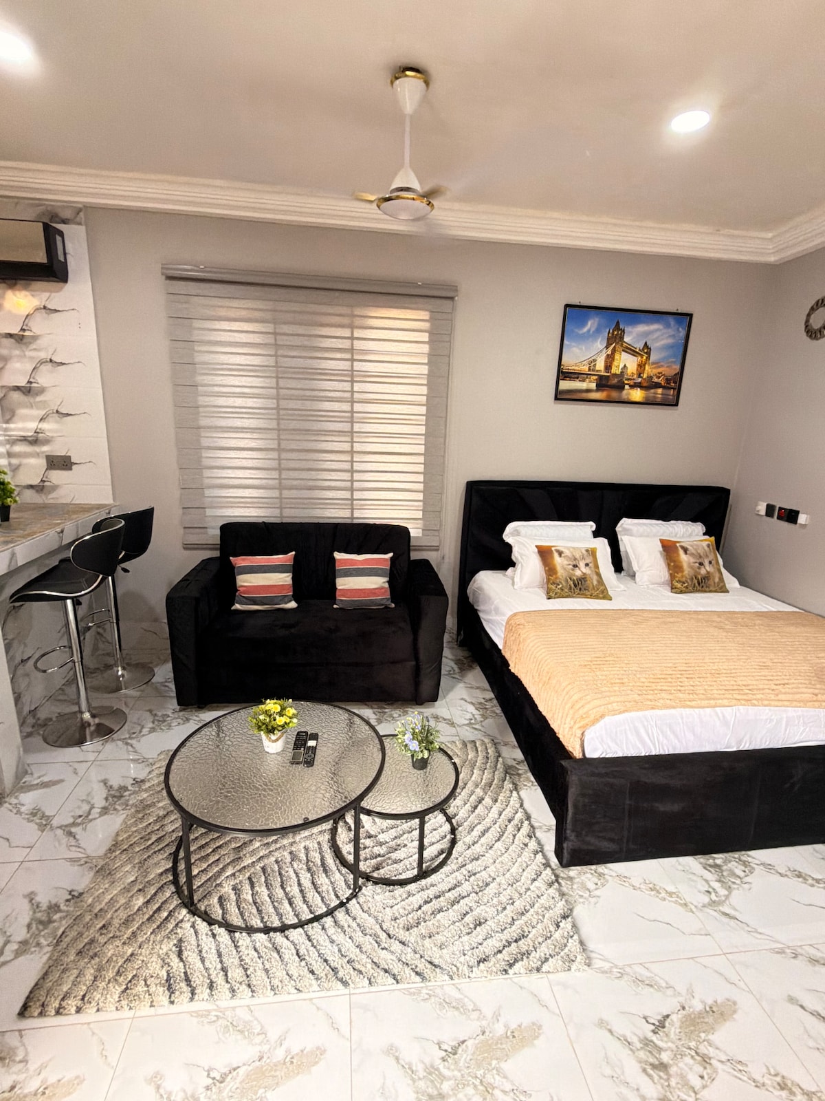 Modern comfort in a stylish, beautifully lit apartment with clean contemporary finish & a warm evening glow that instantly feels upscale & inviting. Located in a quiet neighborhood 19mins from the Airport, 17 from accra mall,10mins from Atlantic Mall, and about 30 mins from the Aburi Mountains, offering easy access to shops, business hubs & leisure centers ..You’re never far away from everything you need yet still tucked away enough to relax & unwind. A chic retreat you’ll love coming home to.