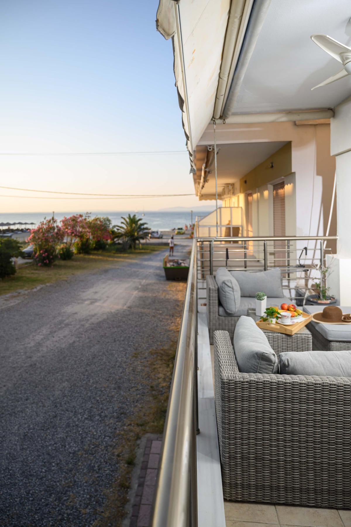 This beachfront apartment features a spacious balcony with beautiful views of Thermaikos Bay and Thessaloniki. It includes a large, cozy living room with a sofa that converts into a double bed, as well as a kitchen with an additional sofa. The small yet comfortable bathroom has a shower and a tap for everyday needs. The kitchen is equipped with a mini oven and complimentary laundry facilities. Additionally, there is unlimited 300 mbps Wi-Fi. The apartment has been fully renovated.