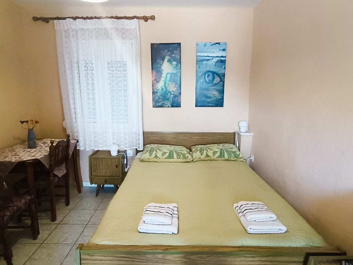 Situado entre 2 pueblos, en los suburbios de Tesalónica, nuestra habitación en el ático ofrece una estancia tranquila en el campo, ideal para las personas que aman la naturaleza (y los animales:). Transporte público al aeropuerto, playas, centro de Tesalónica. Hay muchas playas cercanas a las que puedes ir a nadar (10-15 minutos en autobús). ¡Hay un súper mercado a 10 minutos a pie de la casa! La habitación tiene una cama doble y un sofá cama.