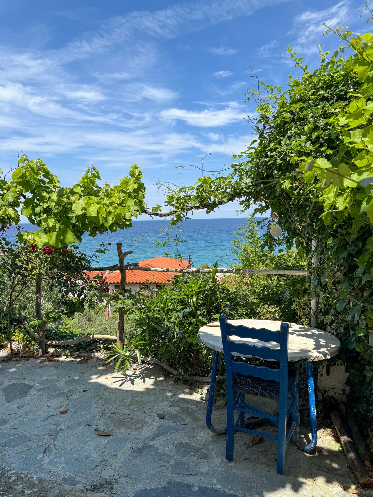Daria's home seaside garden perfectly blends with its surroundings and is built on a plot of land that feels secluded and sheltered by the nature. The house boasts a spacious green garden with sea views. Large window opening gives the feeling of “touching” the garden green and the sea in the background at the comfort of the double bed. The spacious studio of 42 sq. meters is beautifully renovated, furnished and equipped to welcome family and friends. Just 3 mins walk from the Agii Saranta beach