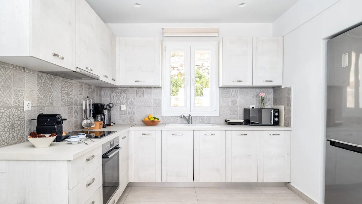 Bonita casa de verano luminosa y cicládica con todos los servicios proporcionados con hermosas vistas al mar Egeo. La casa combina muebles modernos y tradicionales. Tiene cuatro dormitorios, dos salas de estar, dos baños completos , tres balcones y terrazas, jardín con palmeras, mucho área de estacionamiento. Wifi de alta velocidad.