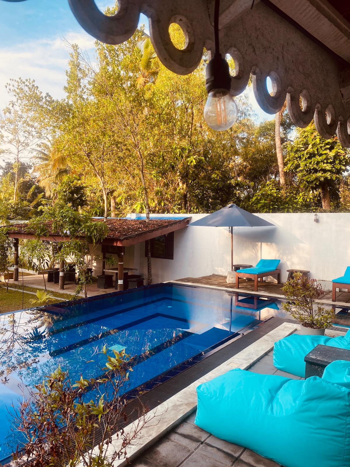 Villa Merkaba es nuestra hermosa casa de vacaciones de nueva construcción en la vibrante ciudad de Ahangama, situada en la costa sur de Sri Lanka. Ubicada en una pintoresca calle residencial entre familias locales y a poca distancia de todo el ajetreo y el bullicio. Perfecta para familias, tenemos dos amplios dormitorios (con una cuna disponible), una cocina moderna totalmente equipada, una cómoda sala de estar, piscina y comedor al aire libre.