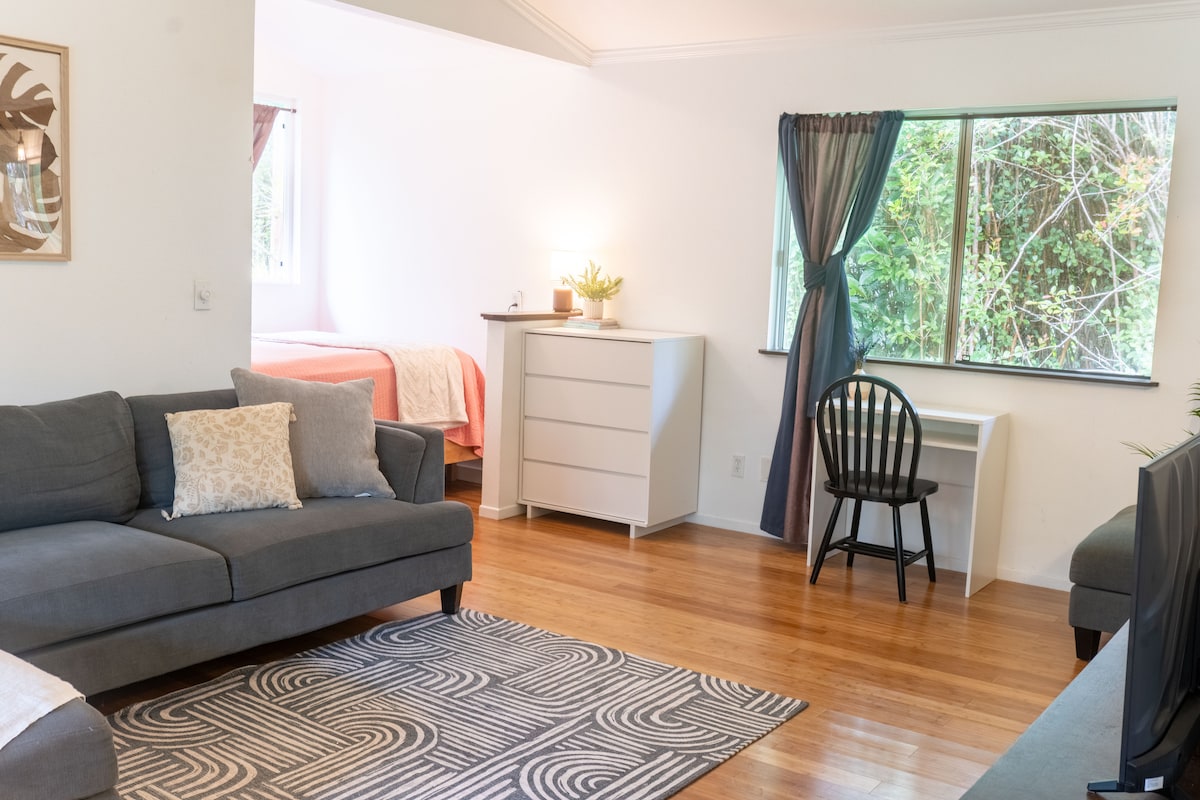 Somos anfitriones de un tranquilo oasis hawaiano, a menos de 15 minutos de Hilo, del aeropuerto de Hilo y a 15 minutos de la ciudad hippie de Pahoa. Nuestra Ohana tiene fácil acceso a la carretera principal, pero lo suficientemente lejos como para estar en completo silencio y sin contaminación lumínica. El estudio está separado de la casa principal y cuenta con una pequeña cocina, baño completo con bañera y aire acondicionado central. Si buscas grandes playas, cascadas y caminatas por la selva tropical y los jardines botánicos, no busques más.