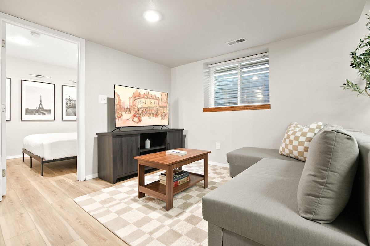 Relajante, asequible y acogedora suite en el sótano de una casa privada con plaza de aparcamiento dedicada. Fácil acceso a la I-25 que permite viajar directamente a Colorado Springs, la Academia AF, Manitou, Castlerock y Denver. Dormitorio amueblado con vestidor, cama tamaño queen; colchón inflable tamaño queen adicional si es necesario. Baño completo, TV, sofá seccional con sillones reclinables, barra seca con microondas, enfriador de agua, horno tostador, nevera de dormitorio, hervidor eléctrico y cafetera.