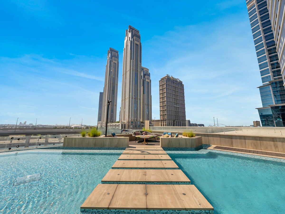 Acogedor 1Bhk cerca de Burj K 800m a Metro|Piscina infinita|