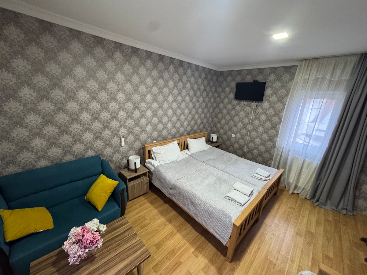 Nueva casa reformada en Borjomi a 5 minutos a pie del centro de la ciudad en una calle tranquila. Un dormitorio con cómodas 2 camas (individuales o dobles) cocina totalmente equipada. Casa ubicada casi en el centro de la ciudad y a poca distancia de mutheum local, bustation, Central Park y parque nacional también.