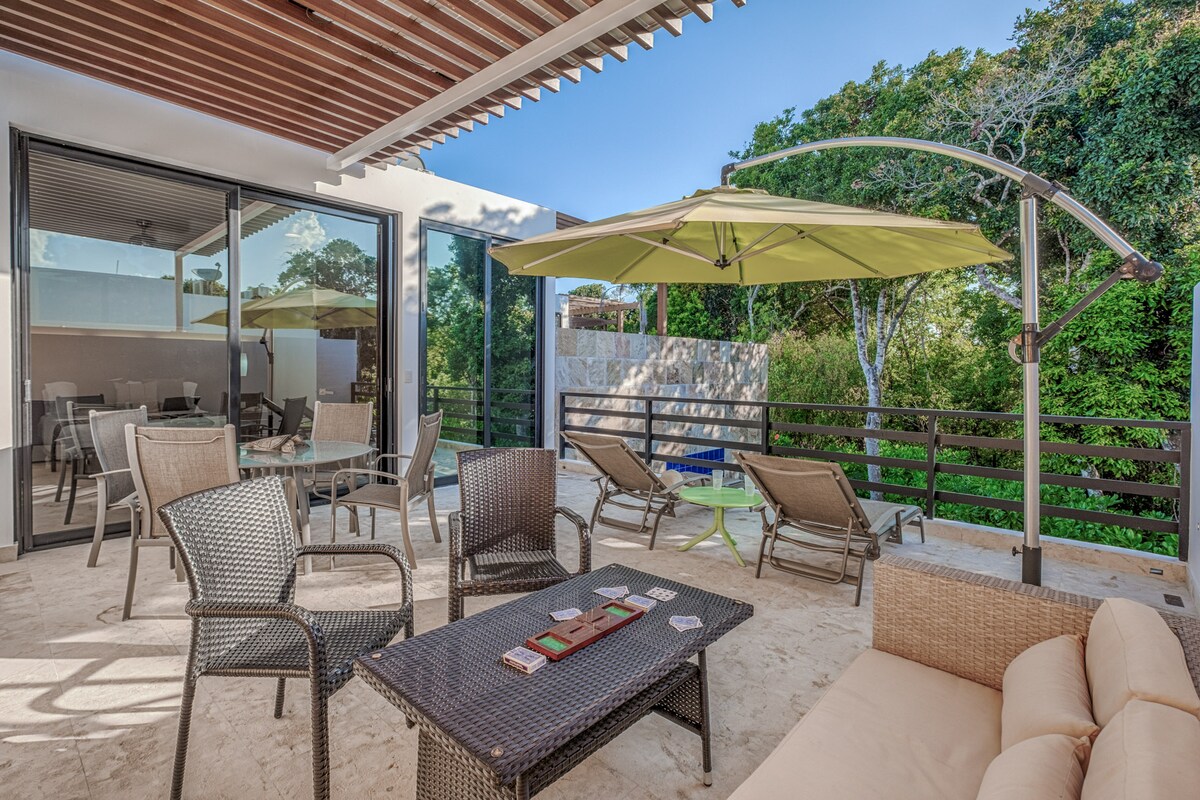 Descubre el paraíso y seguridad en Residencial Bahía Príncipe, estratégicamente ubicado entre Tulum y Playa del Carmen. Nuestra acogedora villa te espera, rodeada de exuberante jungla de la Zona Maya y a minutos del Mar Caribe. Disfruta de comodidades modernas y todo lo necesario para tu estancia. Internet de alta velocidad, estacionamiento y acceso a 2 piscinas en áreas comunes. ¡La playa está a menos de 5 minutos en auto sin salir del complejo! Tu escapada perfecta en la Riviera Maya.