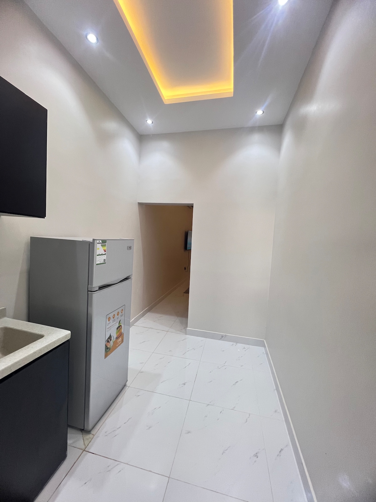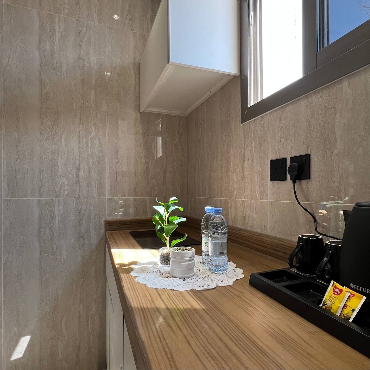Apartamento de diseño moderno con un dormitorio y una sala de estar Tiene un dormitorio con una cama principal con colchón de hotel y un amplio espacio con un televisor inteligente de 60 pulgadas soportado por una suscripción a Netflix. Equipado con un refrigerador, una cafetería y un té Herramientas de tetera y tetera Un baño totalmente equipado además de acceso gratuito a internet de alta velocidad. El apartamento cuenta con alta privacidad. También hay un ascensor y estacionamiento privado ubicados en el distrito de Al Rayyan.