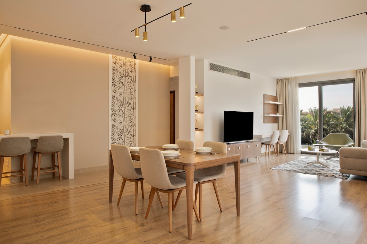 Welcome to Sahara a serene 2-bedroom, 2-bathroom apartment inspired by the desert and the natural beauty of Africa. An ivory and burgundy color palette, paired with natural wood furniture and a wide sunlit window, creates a space of calm and stillness. Relax on the cozy window bench, escape into a good read in the book nook, or simply unwind in this warm and welcoming home. Sahara is the perfect blend of comfort, tranquility, and natural charm.