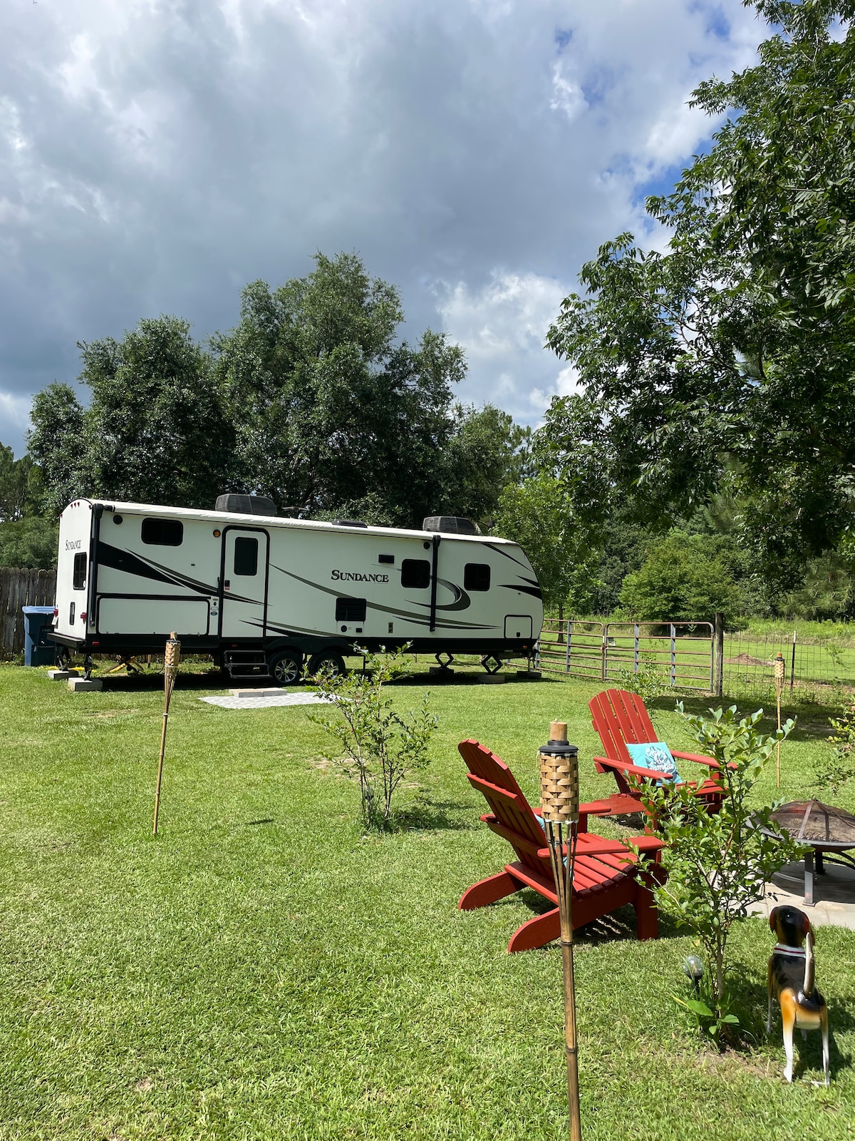 Nuestra caravana Heartland Sundance de 27 pies está preparada para los huéspedes en un pequeño terreno en la parte delantera de nuestra propiedad agrícola. Los huéspedes tendrán una gran vista de nuestros pastos con nuestro pequeño rebaño de vacas y caballos. Esta zona está preparada para una experiencia de glamping. Esto incluye un pozo para hacer fogatas, sillas y parrilla al aire libre. La caravana tiene 1 dormitorio principal, 2 literas individuales, la mesa y el sofá también se convierten en camas. Esta caravana es 1 de 2 caravanas ahora disponibles en nuestra granja.