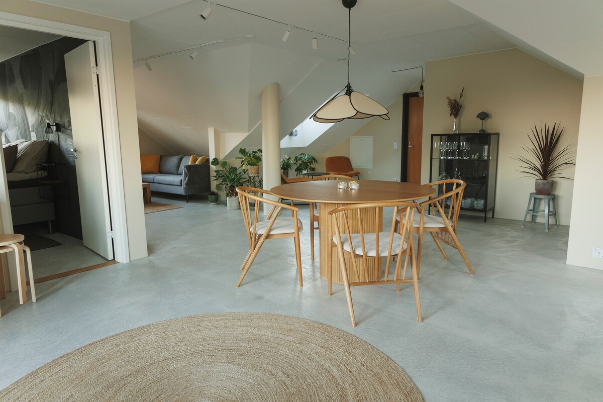 Amplia y encantadora casa en un loft luminoso con diseño moderno, elegantes suelos de hormigón y tonos terrosos. Vistas en varias direcciones con vegetación exterior y un vistazo al mar desde la cocina. Los espacios abiertos, los toques florales y los dos balcones soleados al sur y al oeste aportan mucha luz natural y sol al atardecer. Cocina totalmente equipada, TV y ambiente armonioso. Cerca del centro, la naturaleza, la playa y la piscina. Capacidad para 6 personas: dos camas de matrimonio y dos camas plegables más pequeñas.
