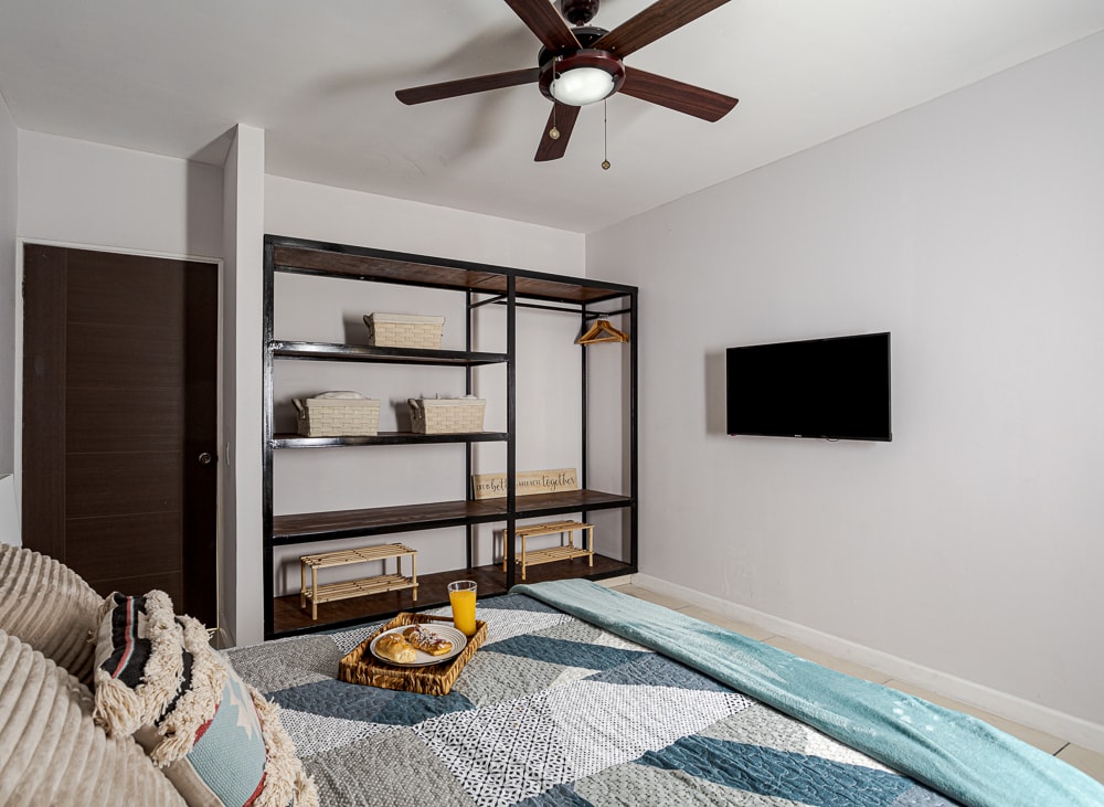 Suite con entrada independiente: estacionamiento techado, cama doble, baño sanitario, cocineta y escritorio. Tu espacio personal en el corazón de David. Cuenta con aire acondicionado tipo split, abanico de techo, TV con acceso a netflix, internet wifi gratis, cortinas black out, tanque de reserva de agua, agua caliente, cocineta equipada con estufa eléctrica, refrigerador, cafetera, microondas y utensilios básicos. No cuenta con lavandería, generador eléctrico y aislamiento acústico.