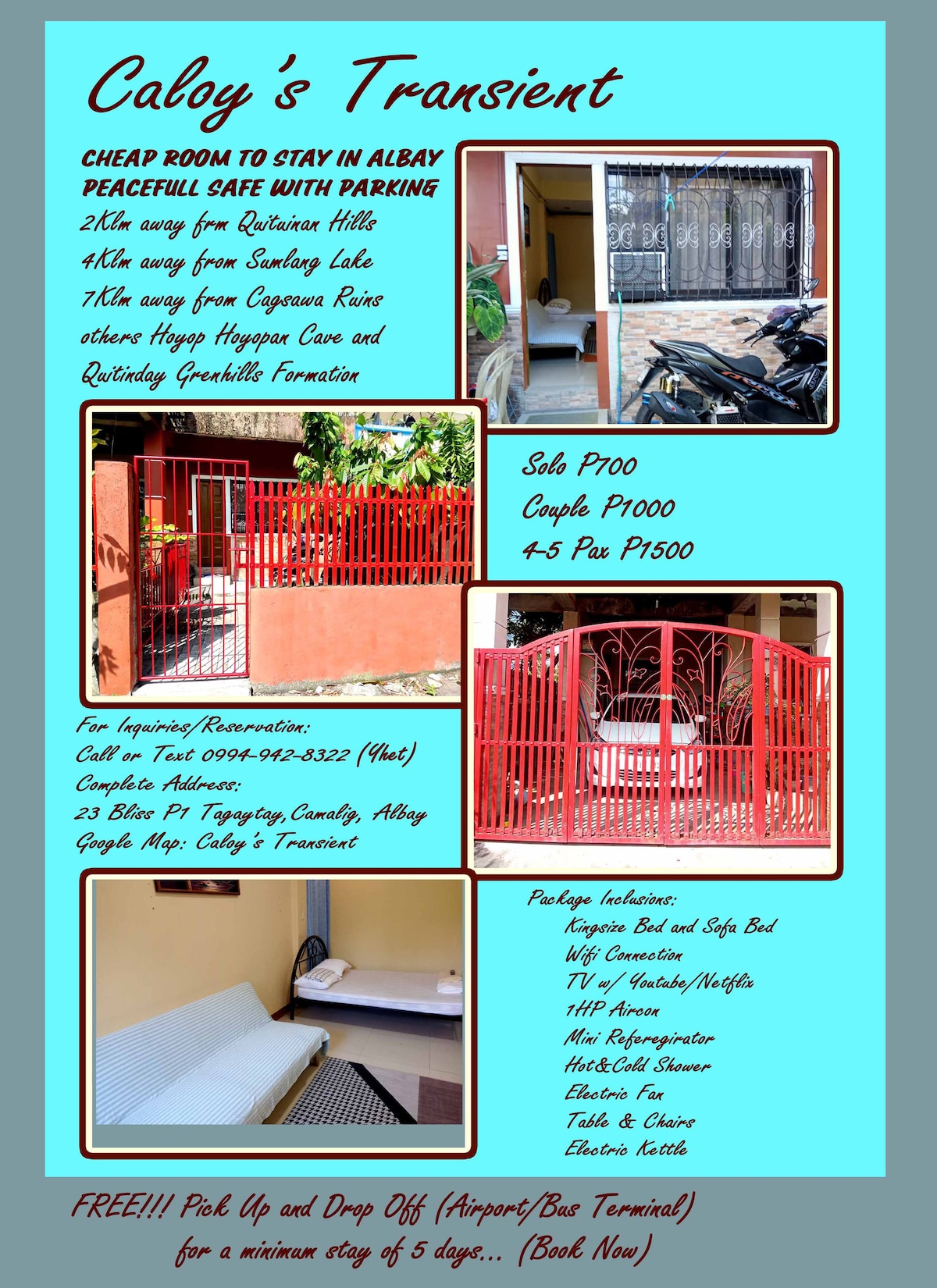 ¡Bienvenido a nuestra acogedora casa de huéspedes en Daraga, Albay! Tranquilo y económico, tiene capacidad para 4 personas (se permiten huéspedes adicionales con un cargo adicional). Hay una panadería justo al lado, mientras que las cafeterías, las tiendas de comestibles y los servicios de lavandería están cerca. Con fácil acceso a GrabCar, estás a solo minutos del volcán Mayon, las ruinas de Cagsawa y lo mejor de Albay. ¡Perfecto para familias, grupos, estudiantes y mochileros por igual! También ofrecemos opciones de desayuno por un coste adicional: solo tienes que pedirlo con antelación