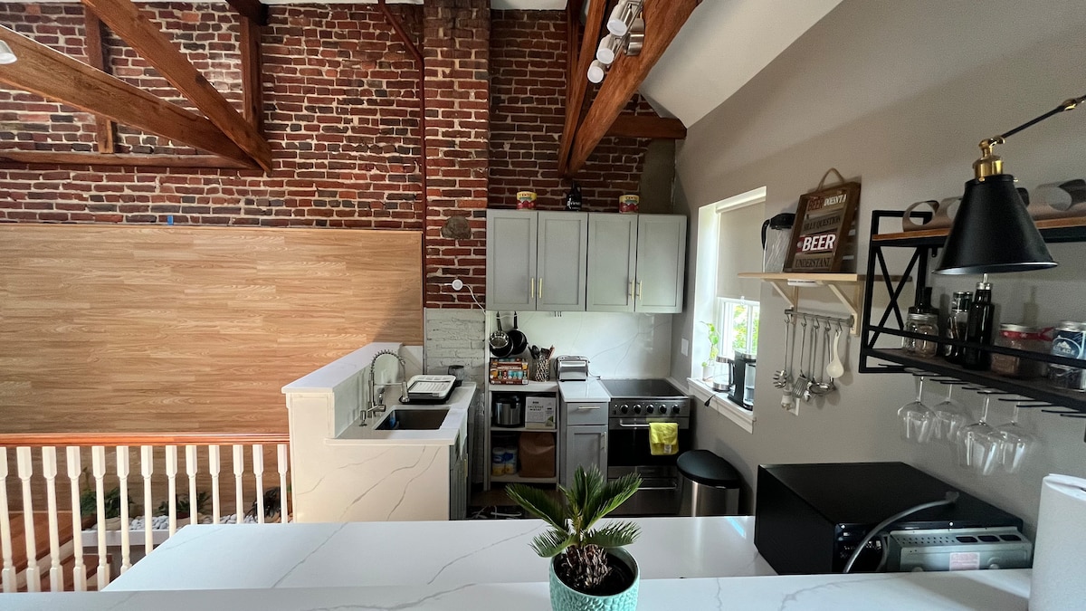 Riverfront loft in the heart of Old Town, steps from Potomac River and King St! New construction studio apartment in a 19th century warehouse with a private roof deck, modern appliances, marble countertops, plush furniture, eat-in kitchen. Great for entertaining, biz travel (fiberoptic 100 MB/sec speed), a romantic getaway, or a week of sightseeing in the nation's capital and water taxi to DC, National Harbor/MGM. Sleeps two comfortably in king bed with option for two more on pull-out couch.