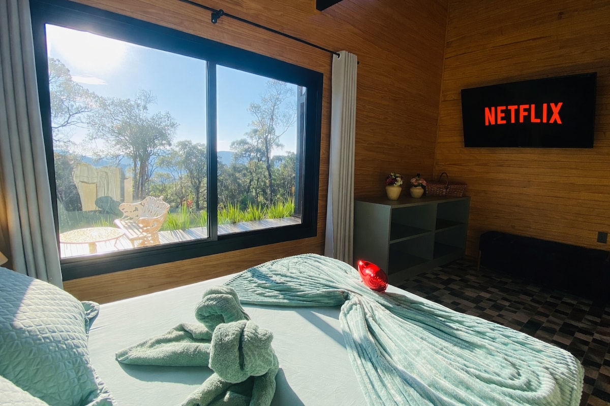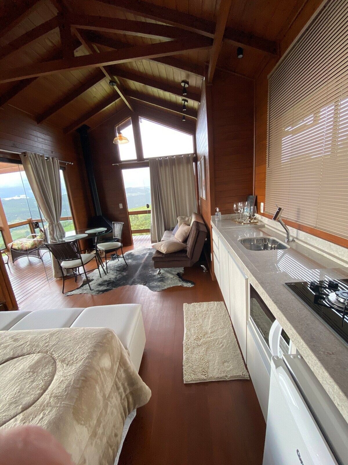 El Chalet es una cabaña romántica, anexa al @sitiorecantoazul, ubicado en Alfredo Wagner/SC. Ideal para parejas, pero con capacidad para + 2 niños en el sofá cama. Sin embargo, no hay división entre los ambientes. Cuenta con bañera de hidromasaje, chimenea, TV con Netflix y YouTube, wifi, aire acondicionado, ropa de cama, baño, albornoces, cocina con estufa, microondas, minibar, parrilla eléctrica y otros utensilios. *¡Proporcionamos una deliciosa caja de desayuno, todos los días entre las 8:00 y las 9:00, entregada en el chalet!*