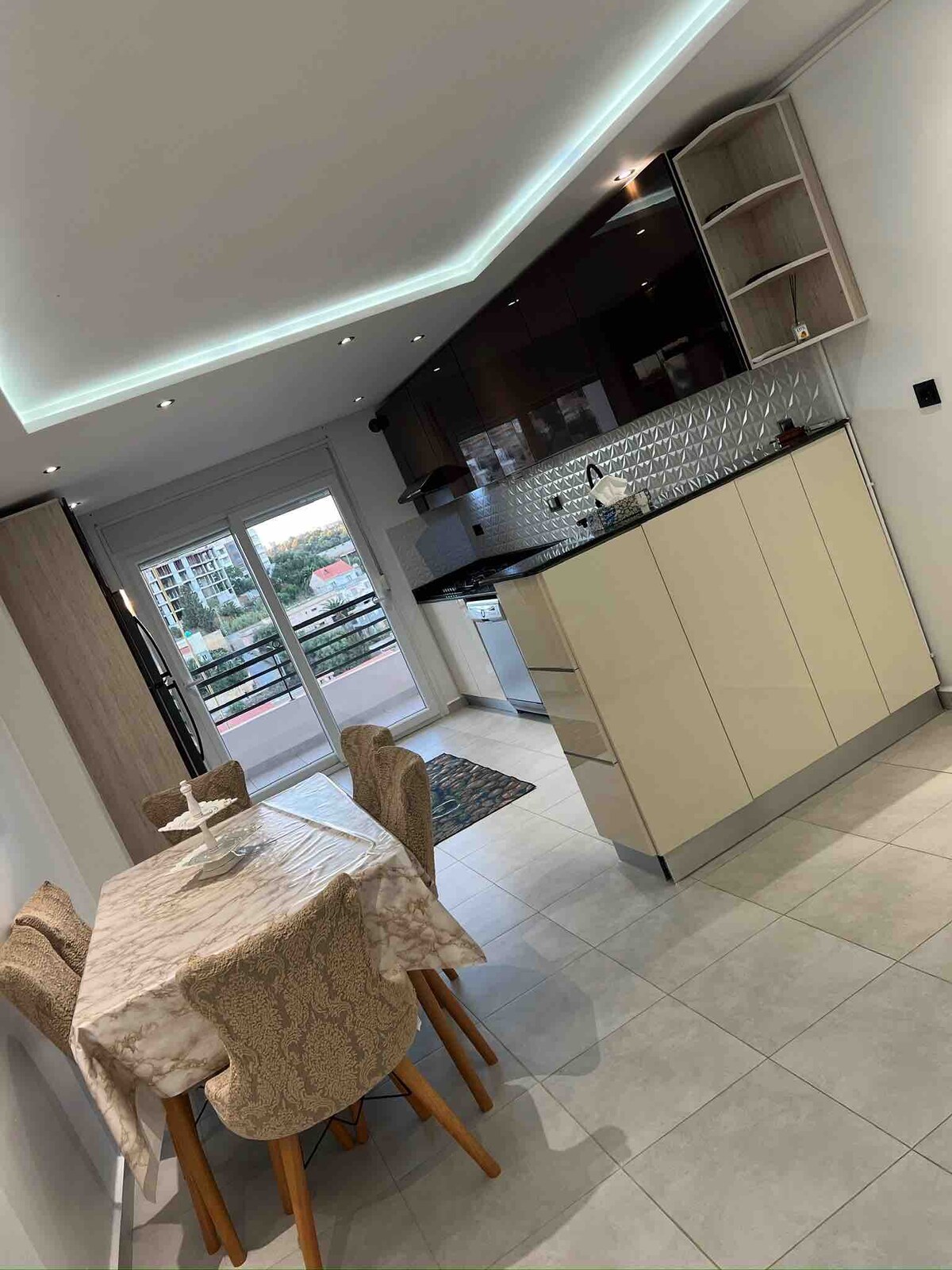 Lujoso apartamento de 2 habitaciones de alto standing con aire acondicionado en una urbanización con seguridad. Apartamento nuevo con todas las comodidades. Espacio de aparcamiento privado con ascensor, parque y jardín. Cerca de la playa y transporte público a 15 minutos del Sheraton y a 2 pasos del centro de la ciudad. Cocina totalmente equipada (horno, microondas, cocina, lavavajillas, lavadora y electrodomésticos...) Cuarto de baño con ducha, suelo radiante y mini «hammam». Una acogedora habitación con cama doble, TV y luces relajantes.