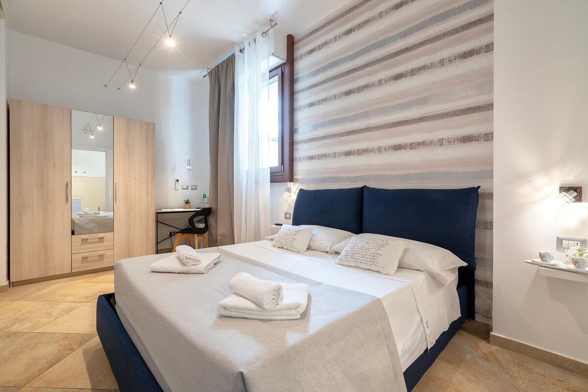 La camera matrimoniale con un richiamo dedicato a risaltare le antiche costruzioni della città e bagno smart in camera è indicata per chi cerca un punto di appoggio per visitare la città. È climatizzata e la colazione è inclusa. Dispone di letto king size h25 160x190. Il bagno è recentemente ristrutturato con nuovi sanitari sospesi e doccia da 90cm. È dotata di biancheria letto e bagno sostituita periodicamente e di ampio guardaroba. Presenta l'aria condizionata silenziosa e altamente performan.