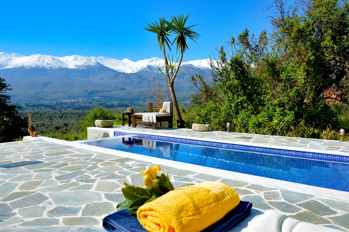 Our villa is composed by noble and natural materials and offers an opportunity for detox from stress and the daily grind, as well as for connection with the Cretan countryside and culture. Our space stands out for its sophisticated rustic atmosphere, with its stone arches, wooden beams and the distinctive fireplace. From the relaxing seating areas, verandas & the swimming pool, our guests can enjoy their privacy with views to the White Mountains, the village & the lush green cretan landscape.