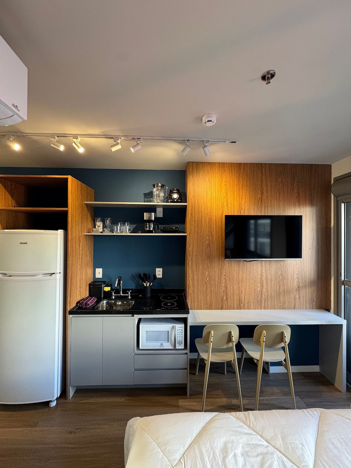 Estudio 40011: a 4 minutos de Allianz Park. Estudio compacto, moderno, completo y cómodo en una de las regiones más culturales de São Paulo. 📍 Rodeado de cafeterías, restaurantes y espectáculos. Aquí late la ciudad ✨ Cama acogedora, encimera, armario, aire acondicionado, TV y cocina equipada con sandwichera, freidora de aire, cafetera, fogones y nevera. 🚿 Baño privado e iluminación acogedora. Con ese rollo de «quiero quedarme un poco más» Perfecto para disfrutar, descansar o trabajar. ¡Reserva ahora!