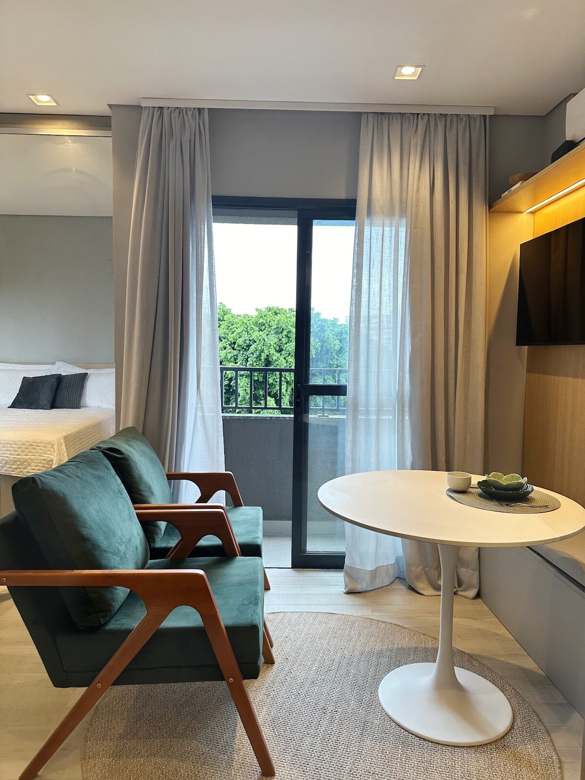 Estudio moderno, totalmente equipado y acogedor a solo unos pasos de Allianz Parque (500 m) y del centro comercial Bourbon. Ideal para parejas, viajeros solitarios y aquellos que asisten a espectáculos, eventos o trabajan en São Paulo. Alojamiento perfecto para hasta 2 personas, con una cama tamaño queen súper cómoda, wifi rápido, una cocina totalmente equipada y una potente ducha de gas. Fácil acceso a la estación de metro Barra Funda (1,5 km), Parque da Água Branca y PUC-SP.