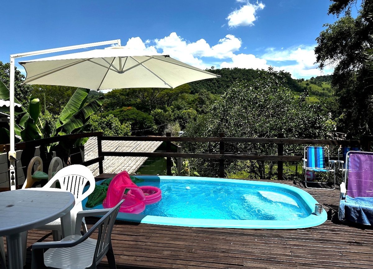 Chalé aconchegante de dois andares, cercado pela natureza, localizado na tranquila Ilha Redonda, em Palmitos. Possui mezanino com cama de casal, ar-condicionado e ventilador de teto. No piso inferior, sala com lareira e móvel que vira cama, além de colchões extras. Cozinha completa, churrasqueira coberta estilo área de festas e piscina em deck com vista verde. Ideal para descanso e lazer. Capacidade máxima: 6 hóspedes.