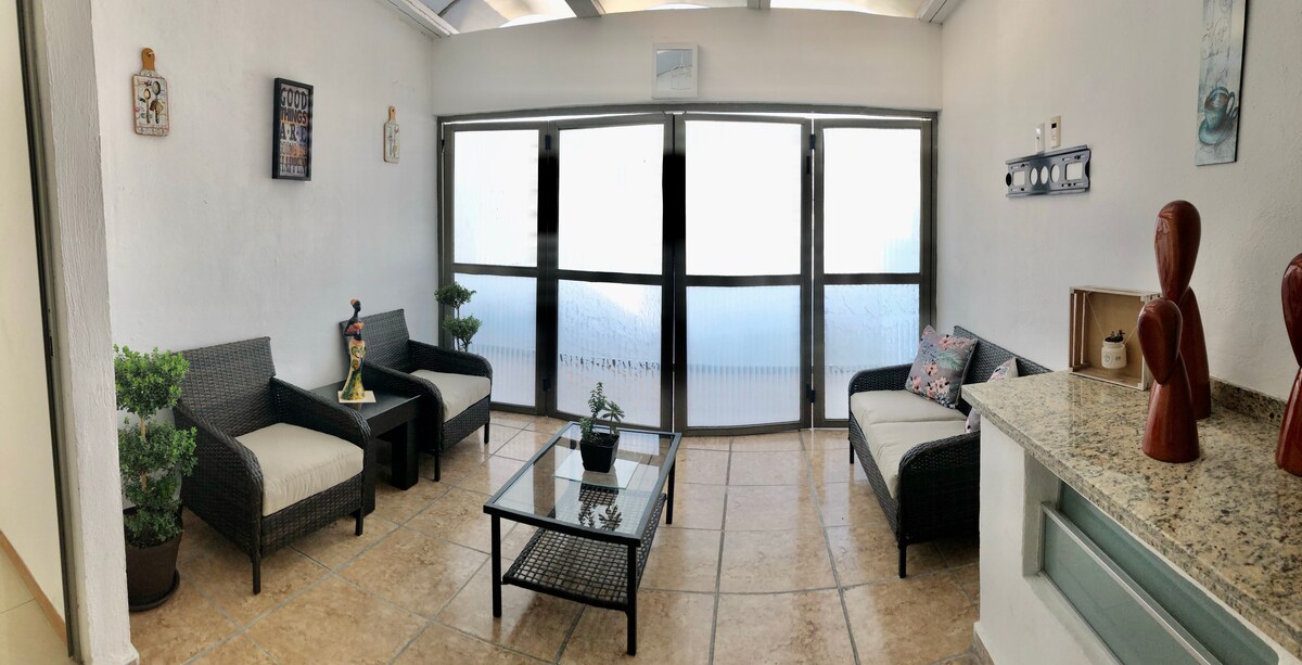 Departamento tipo Loft pequeño con todo lo necesario para una estancia placentera -Cocina Privada con Parrilla, Refri, Micro, Utensilios; ahorra y haz tu super -Baño Privado pequeño y espacioso -Escritorio Amplio y Wifi Veloz, trabaja desde aquí -Cama Matrimonial, descansa y ve la Smart Tv en un colchón confortable -Espacio Suficiente, guarda ropa doblada o colgada -Ventanas Amplias, gran iluminación y ventilación Gran Ubicación para Turismo, Viaje de Trabajo, Estudiantes o Salida en pareja