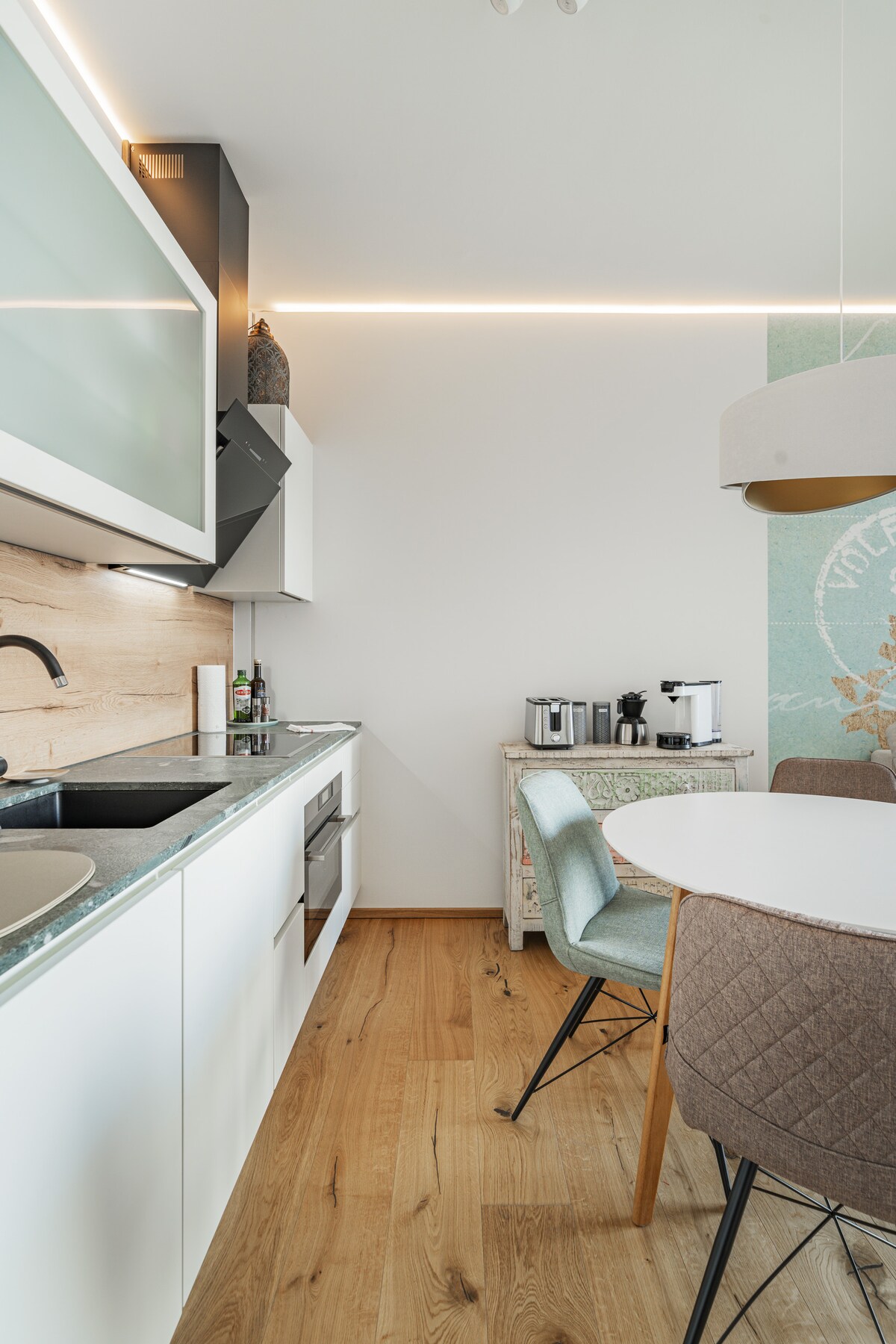 Utilizamos materiales de alta calidad en todos los apartamentos Praterloft (¡después de todo, somos arquitectos!) Estamos seguros de que estarás encantado con los suelos de madera maciza, las ventanas de madera y una combinación de colores a juego. Hay techos abovedados de 14 pies en todas partes y mucha luz natural procedente de las ventanas orientadas al sur. Los apartamentos están amueblados con una mezcla de antigüedades y clásicos modernos e incluso piezas hechas a medida.