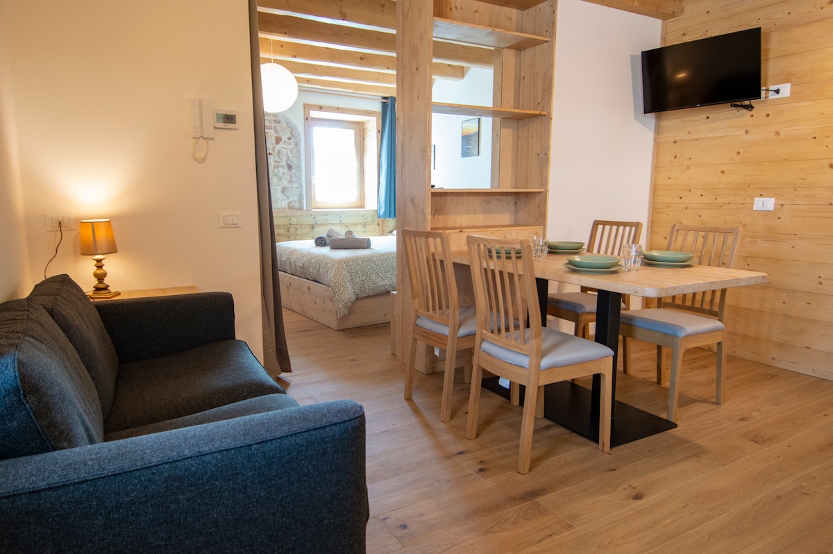 La Suite di 50 mq al piano terra è un caldo ed accogliente loft dal cuore montano. Dotata di un letto matrimoniale,vasca idromassaggio a 2 posti, angolo spa vetrato con bio sauna e doccia. La zona spa è fornita di olii essenziali, asciugamani ed accappatoi. La cucina nascosta è attrezzata di lavello, piano induzione, microonde, frigorifero, lavatrice, macchina caffè. Comodo divano letto per i più piccini. Smart Tv 40 pollici.