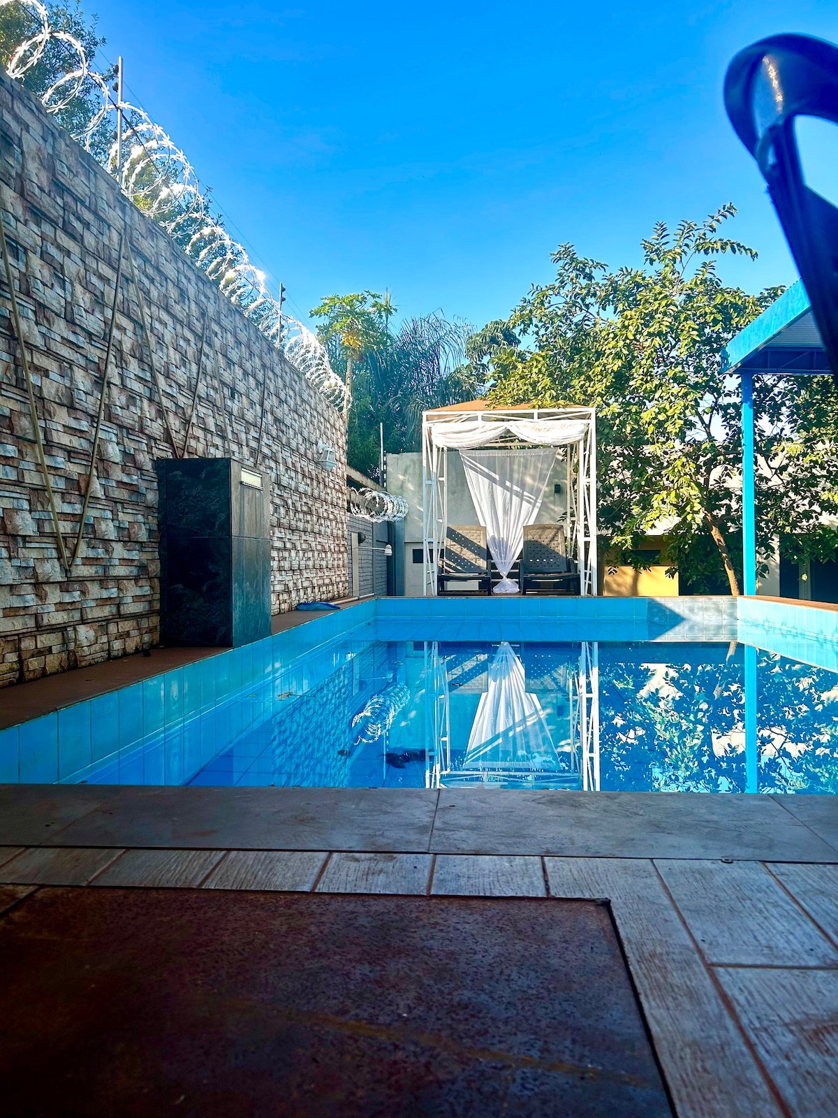 Ubicada en un barrio tranquilo de Ciudad del Este, nuestra casa de huéspedes ofrece descanso, privacidad y contacto con la naturaleza. Cuenta con sala luminosa, cocina equipada, baño moderno y altillo con cama king size. Ideal para relajarse, estudiar o desconectar, cerca de universidades, cafeterías y transporte. Un espacio acogedor y moderno en un entorno tranquilo, perfecto para disfrutar de la serenidad sin alejarse de la ciudad.