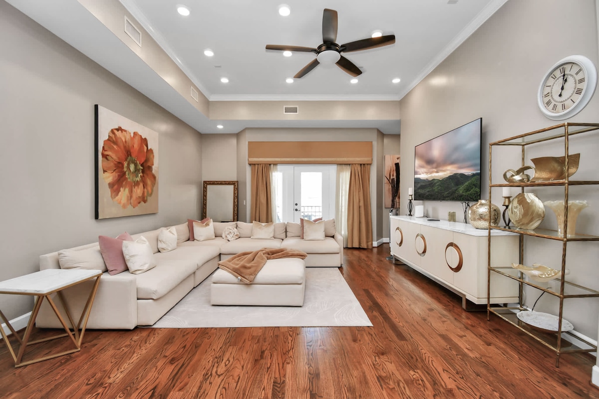 Bienvenido a este elegante refugio de 3 dormitorios en el distrito EaDo de Houston. - Amplio espacio de 3000 pies cuadrados en tres niveles - Lujosas camas tamaño king y cocina moderna - Garaje privado para dos coches y balcón - Wifi de alta velocidad y televisión por cable premium - Cerca de Minute Maid Park y Toyota Center - Lugares de vida nocturna y bares locales cercanos - Apto para familias con Snoo Bassinet y trona disponibles Disfruta de lo mejor de Houston desde este refugio urbano perfectamente situado.