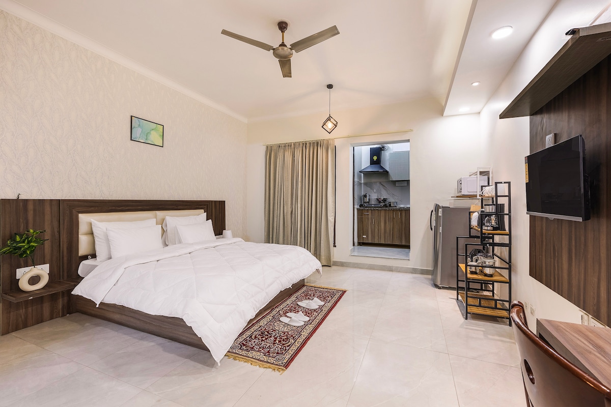 Managed by Perch Service Apartments. Top rated hospitality has helped us win the hearts of our guests and several awards since 2011 • Medium size Studio Apartment w balcony: Moulsari Avenue • Fully equipped Kitchen (Cooking Hob, Utensils, Cutlery, Refrigerator, Microwave etc) • Central Kitchen , Room ordering & Breakfast Lounge • Breakfast avbl at Rs 295/ person • Gym & guest lounge w large smart Tv • 5 min walk to Ambiance Mall & DLF Cyber City • 500 mts to Moulsari Ave Metro Station