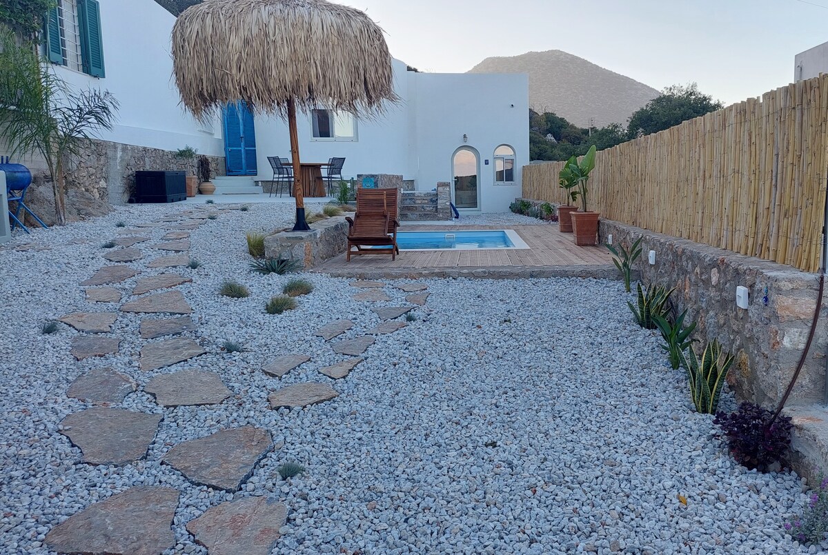 Boho-chic newly renovated sea view holiday residence . Two ensuite double bedrooms with tranquil living area. Fully equipped kitchen + coffee machine. 200 m / 5 min walk to Ammoudara sandy beach. Private pool ( May-November ) in spacious garden. Large patio. Garden furniture. Outdoor kitchen / BBQ area overlooking the sea and the beach tavernas. Back natural flora garden, a perfect relaxation area with sea views. 5 min drive from Agios Nikolaos center. 45 min from Heraklion airport. Parking.