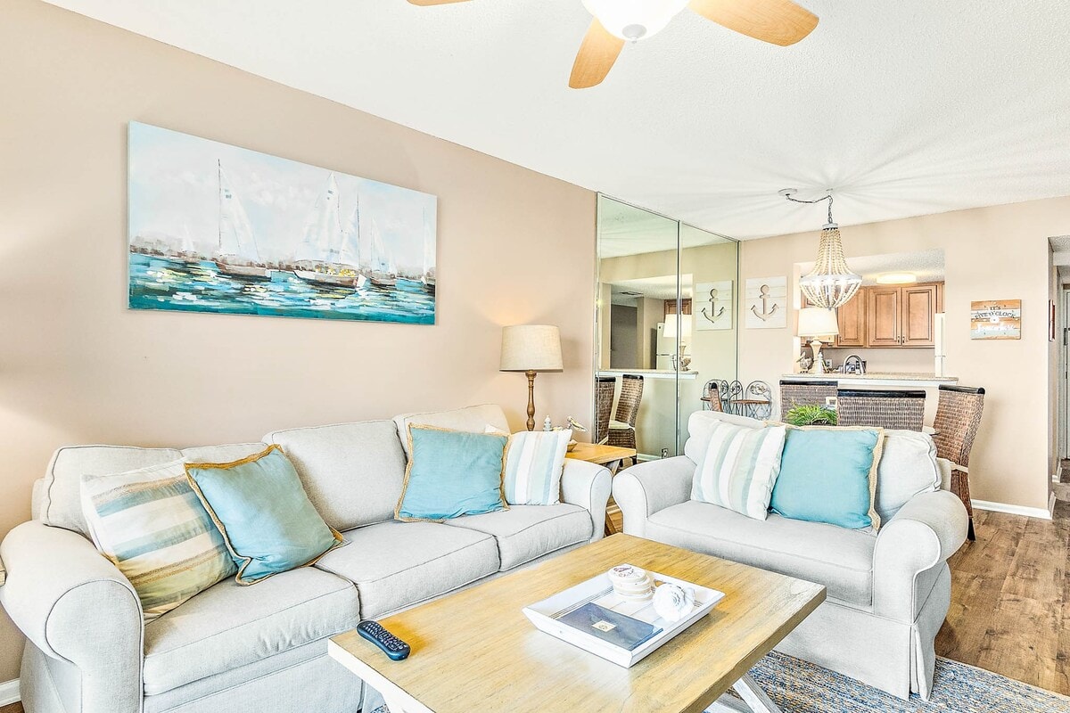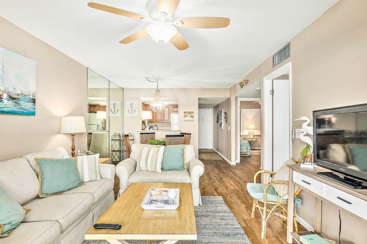 Apartamento de 1 dormitorio recién remodelado con cama tamaño king, sofá cama tamaño queen, televisores de 55 pulgadas en la sala de estar y el dormitorio. Escaleras a la unidad del tercer piso con patio privado. Cocina totalmente equipada, lavavajillas, lavadora/secadora, wifi, TV por cable, casa club, gimnasio, canchas de tenis, 2 piscinas (1 climatizada), canchas de tejo, zona de picnic con parrillas y pasarela privada a la playa. Se admiten perros (SOLO 1 PERRO) con una tarifa de mascotas de 100 USD que se debe pagar en el momento del registro. Debe ser capaz de subir escaleras. Apartamento en un tercer piso.