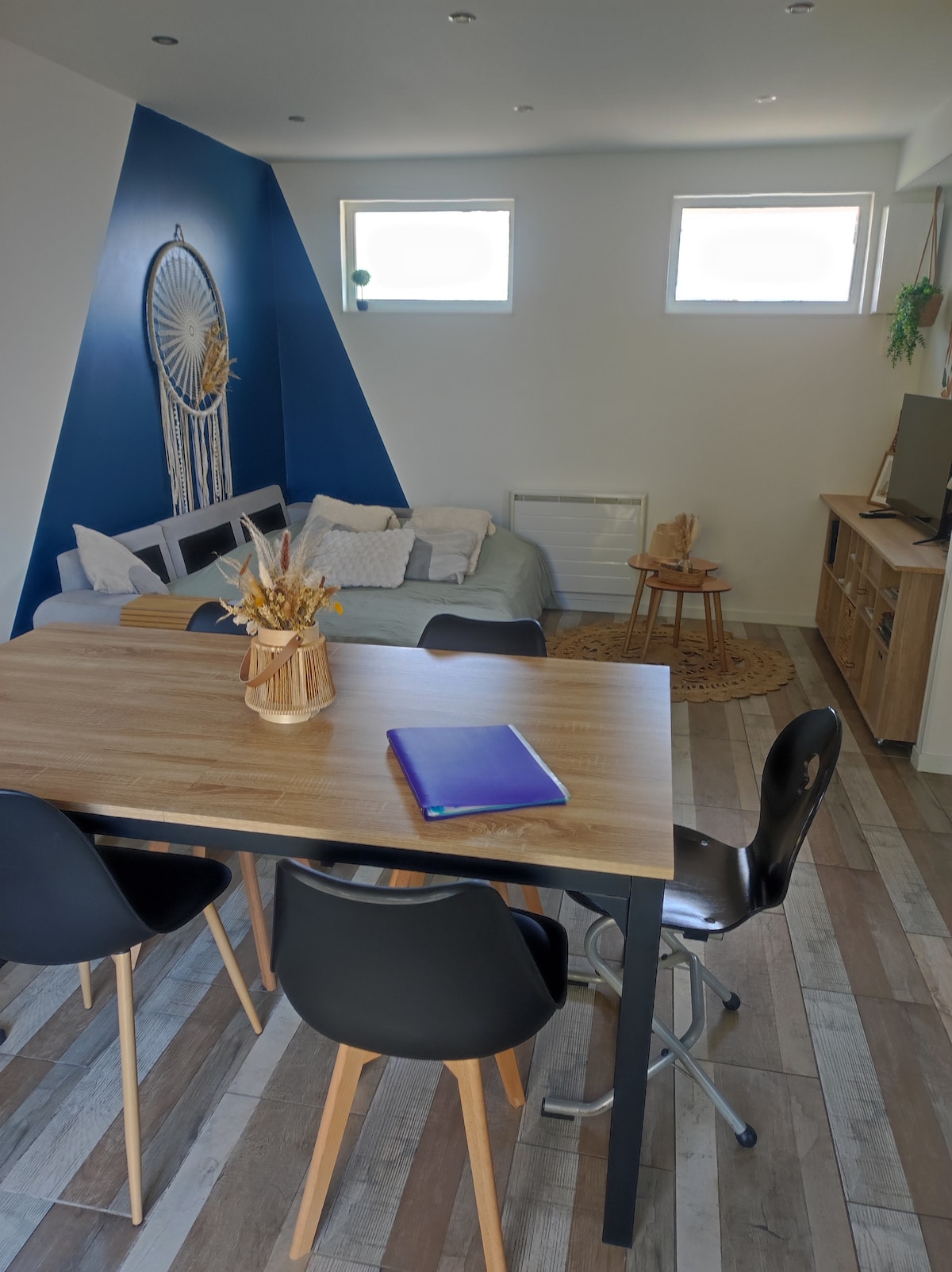 Relájate en este alojamiento privado ubicado en un entorno muy tranquilo 🌳 ; - Habitación para 2 personas con terraza en planta alta. - Baño con ducha. - Salón luminoso con cocina totalmente equipada. - Salón con televisión y sofá eléctrico. En el lado exterior, disfrute de un magnífico paisaje en el campo así como de una plaza de aparcamiento privada. - Cerca de autopistas. - A 15 minutos de Citée Europa. - 10" del lago Ardres. - 15" de la playa y del puerto de Calais.