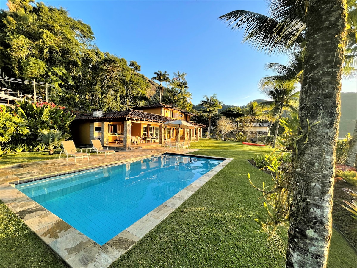 Casa com vista belíssima para as águas cristalinas de Angra. O condomínio é fechado, com praia, a casa conta com píer, muito verde e poita. São 6 quartos, sendo que 4 são suítes, área gourmet integrada com a área da piscina. Cozinha totalmente equipada. De carro, em 25 minutos é possível chegar no centro de Angra dos Reis, com acesso a comércio, shopping, restaurantes. O aluguel inclui roupa de cama e banho e os serviços de um caseiro. A diária da funcionária é R$ 180,00. Não é cobrado energia.