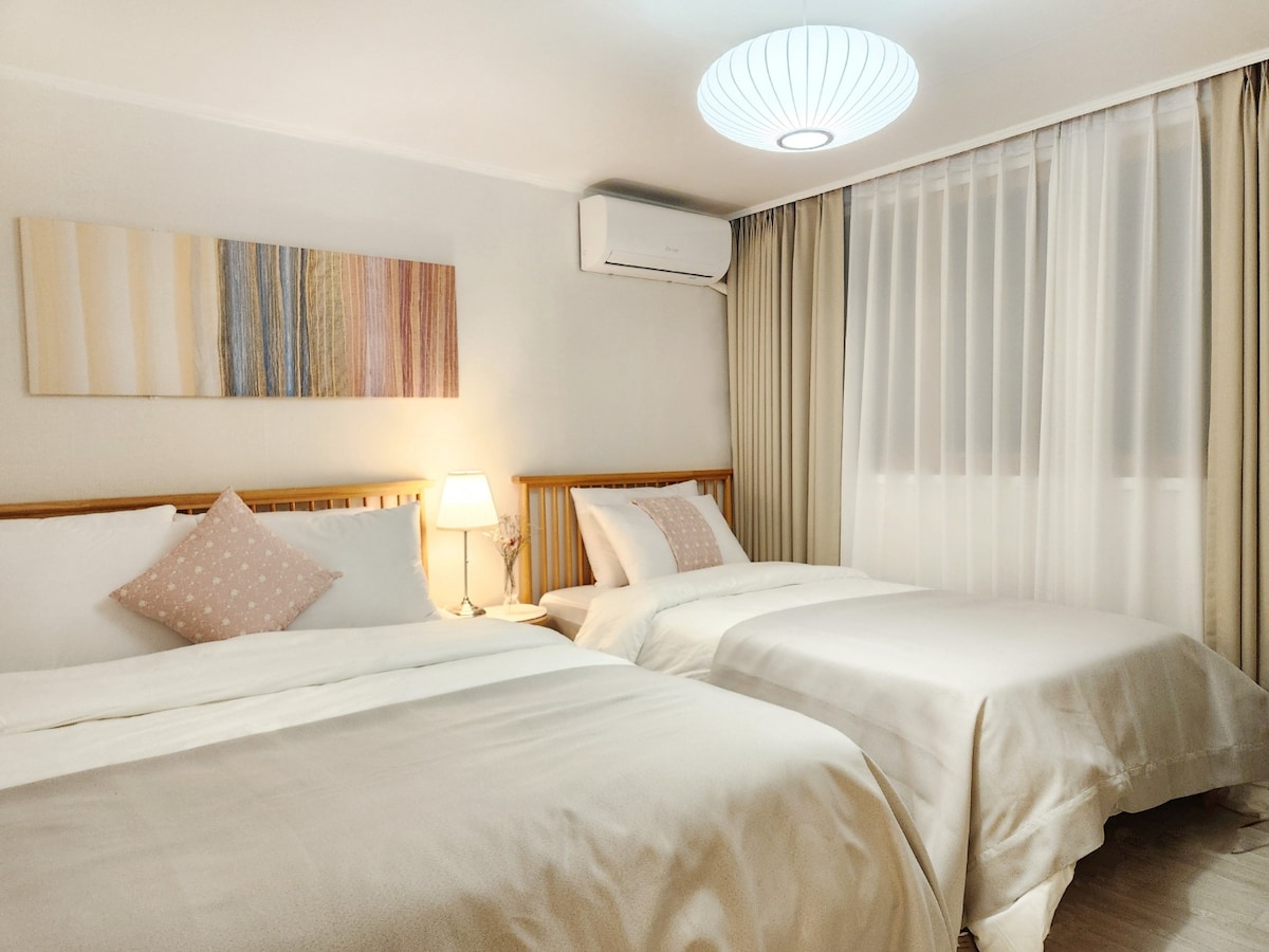 💜 신축건물 조용한 주택 2층 입니다. 💜 깨끗하고 사랑스런 컨셉의 퀄리티있는 숙소를 거품없는 가격으로 제공하고 있습니다. 💜 23평 넓고 쾌적한 공간. 호텔식 침대 및 침구. 6인 대형 테이블이 마련된 독립 다이닝룸. 50인치 스마트 TV (유튜브, 넷플릭스, 티빙 개인계정 시청가능) 💜 예약인원 외 추가인원 입실 불가. 적발시 환불 없이 즉시 퇴실 조치 (방문인원 입실불가 ) ※ 공동현관 CCTV로 체크합니다. 💥1~2인 예약시 : 침실1 또는 침실2 중 선택 (기본 침실1 제공) 제공외 침실 CLOSED 침실1, 2 모두 사용시 1박당 3만원 추가요금 발생 💥 3인 예약시 : 침실1 + 침실2 (슈퍼싱글 침대) 💥 4인 예약시 : 침실1 + 침실2 (슈퍼싱글+싱글침대)