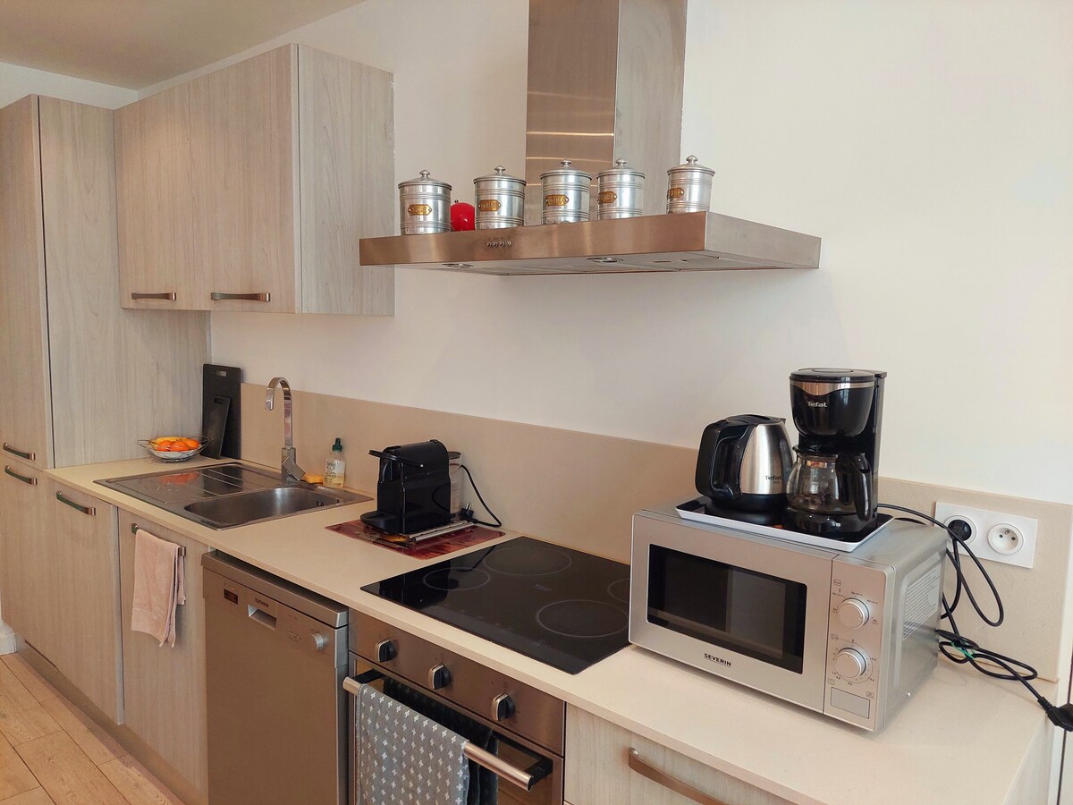 Complejo de lujo único en la Costa Azul con SPA, 2 piscinas, gimnasio y cancha de tenis Departamento con enorme terraza, acabados de alta calidad y es nuevo. Tiene capacidad para 4 personas , hay un sofá plegable en la sala de estar. 🏖️ A 400 metros de la playa 🛒 A 500 metros de la ciudad, tiendas y restaurantes 🌳 Justo al lado del parque. Ubicación muy tranquila con vistas al jardín. Incluye aparcamiento subterráneo vigilado. 🅿️ Perfecto para unas vacaciones en la playa ☀️