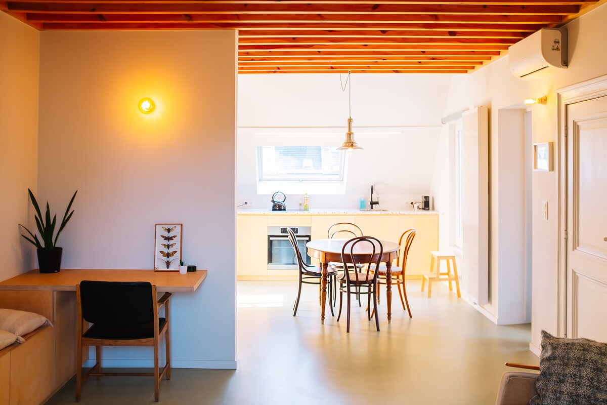 Te damos la bienvenida a este encantador apartamento en el segundo piso de una casa auténtica. Se distribuye en dos niveles y está conectado por una escalera compartida. El diseño divide tu dormitorio y baño privados a un lado y tu sala de estar y cocina privadas al otro. Situado en la segunda calle más antigua de Amberes, este barrio está rodeado de parques verdes. Gracias a las excelentes conexiones de transporte público y una estación de bicicletas compartida, estás a solo 15 minutos del centro.