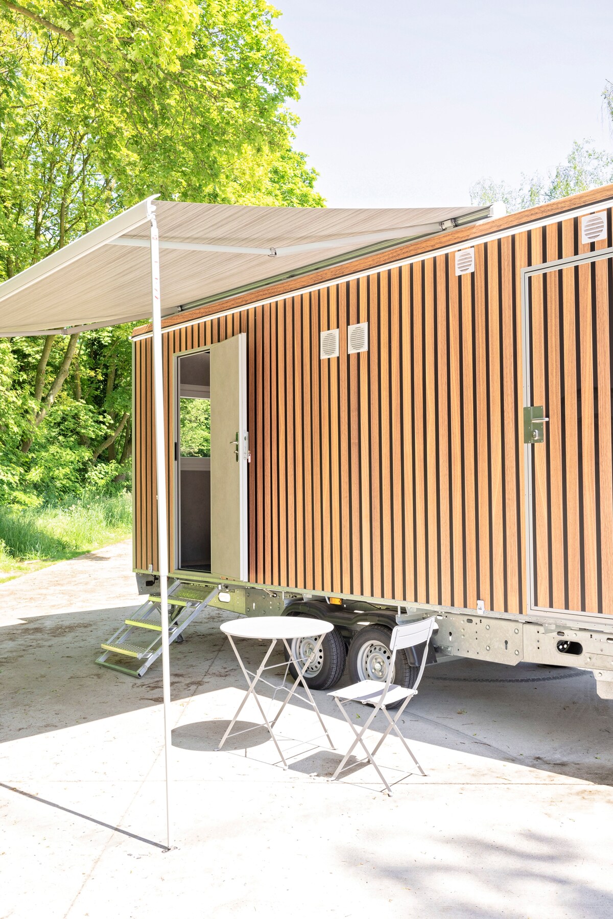 Acogedora casa rodante, cubierta de madera. Cálidamente decorado con iluminación LED, instalaciones de cocina e inodoro móvil. Cama para 2 personas con espacio de almacenamiento debajo. Bonito equipo de la caravana: mesa, sillas y cubos para el stock, así como bolsa de refrigeración. Para 2 personas. Cubre las pantallas para los parabrisas. Cámara inversa.