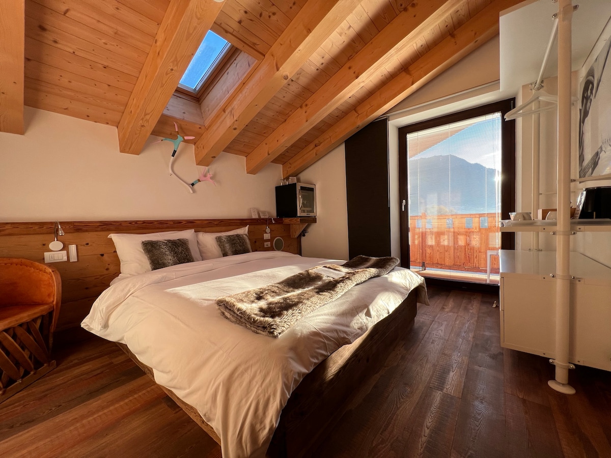 Camera matrimoniale comfort, dotata di box doccia multifunzione e bagno turco, wifi gratuito, impianto audio stereo, cantinetta frigo con bevande di benvenuto, bollitore con caffè, té e tisane, balcone affacciato sulle montagne. Il prezzo indicato è per il solo pernottamento colazione esclusa. Il prezzo per la colazione è di 15€ a persona.