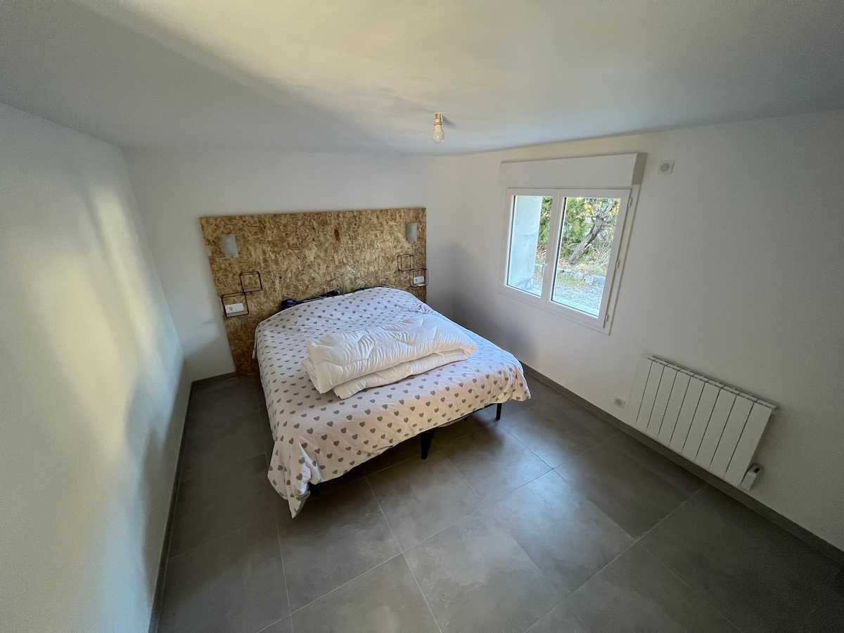 Très agréable maison d'architecte de plain-pied entièrement rénovée et entièrement climatisée sur un terrain de 3000m2 au calme , piscine 9x3m chauffée au printemps et à l’automne , 2 chambres spacieuses , cuisine entièrement équipée, wc séparés, salle d'eau à l'italienne en travertin ainsi que tous les sols et terrasses, salon d'extérieur couvert, plancha gaz et parking. Linge de lit, de toilette et de piscine fourni Entre Gordes et st saturnin les apt idéalement située pour visiter le Luberon