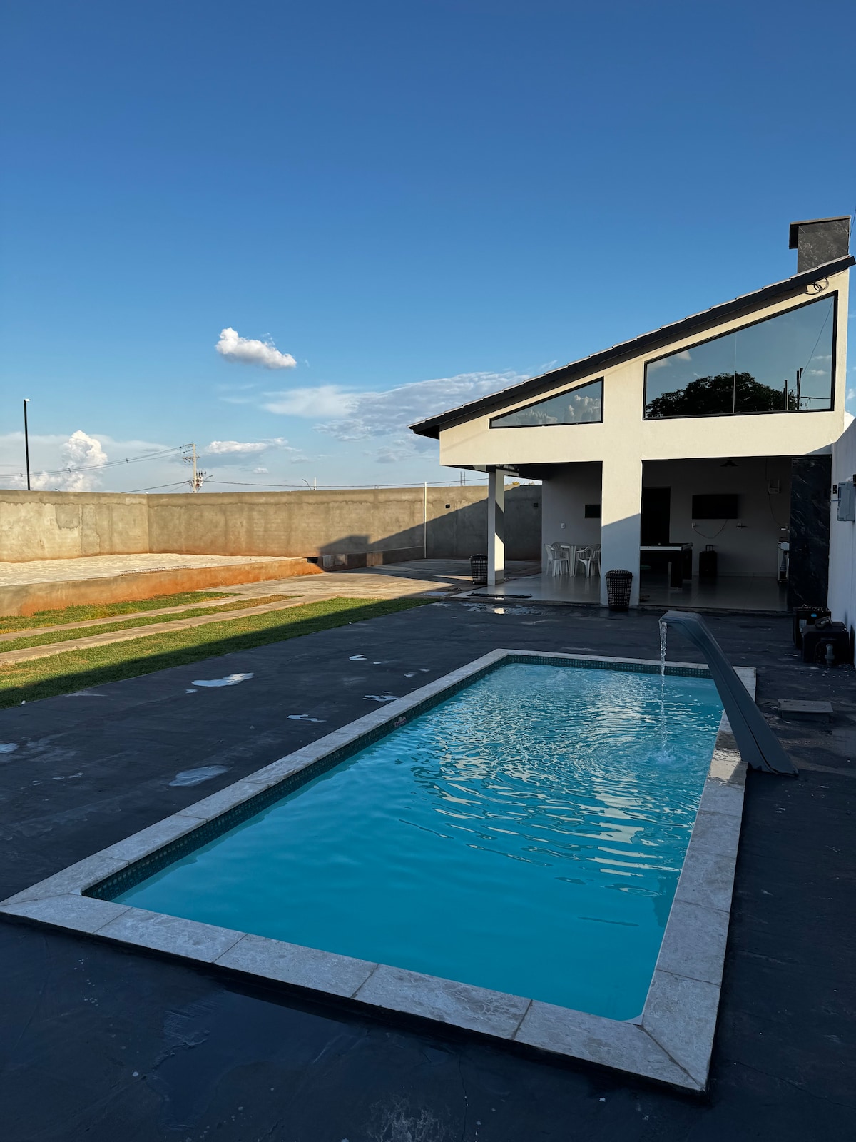 Casa com piscina, campo de areia e churrasqueira.