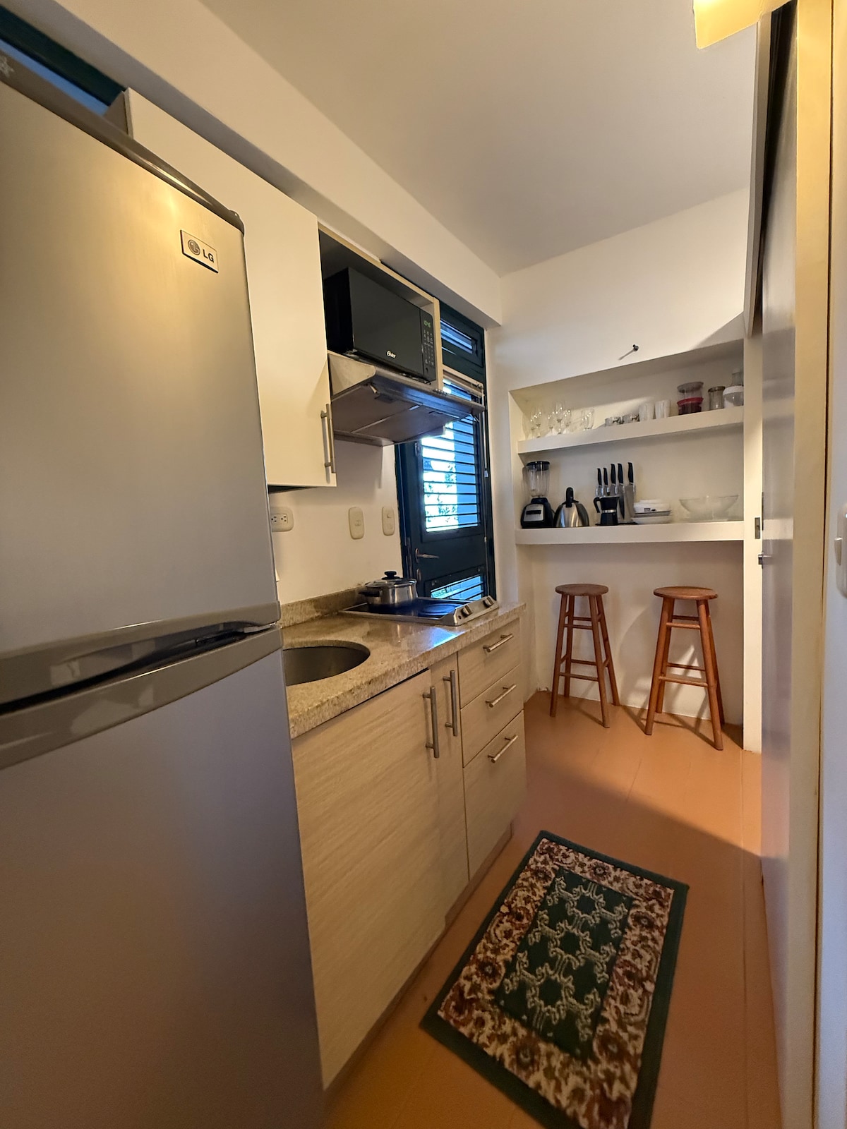 Suite acogedora, con todos los servicios, dos espacios, al acceso pequeña mesa con sillas nevera ejecutiva y microondas y baño y closet, habitacion con cama doble pilow tamaño queen. Inmejorable diseño y equipamiento. Ubicacion en planta baja, pequeño porche