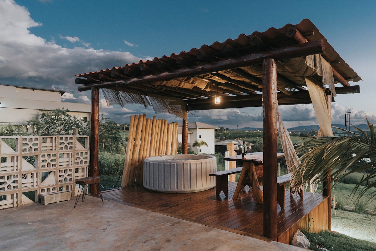 SIGA-NOS NO |NSTAGRAM @ENCANTOCERRADO Um refúgio moderno para casais no coração da natureza do cerrado. Com design contemporâneo e toques rústicos, a cabana oferece vistas panorâmicas, amanheceres e noites estreladas. Completa com uma cozinha totalmente equipada e sala de estar com hidromassagem. A varanda privativa inclui fogueira e piscina aquecida para momentos românticos. Uma oportunidade única de fugir da rotina, criar memórias e celebrar o amor em meio à natureza exuberante do cerrado.